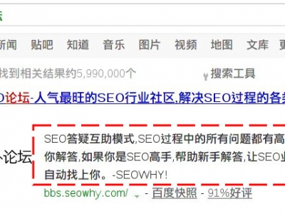 看看下面这个例子,当有人搜索"SeoWhy"论坛名称时,出现在列表上的网页,都会显示一段描述性的文字,以帮助搜索者抉择是否点击该此网页,所以写得越清晰越有吸引度,对SEO也会越有利.