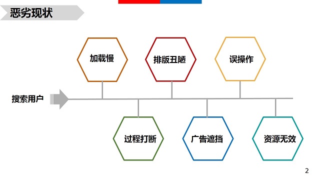 其实在移动时代,大家可能也发现到了,百度的PC搜索可能更多的都是关注在搜索的权威性、时效性以及相关性,但是在移动搜索阶段,现在百度好像管得更宽了,对移动页面也提出了更多的要求。在这里其实很好理解,我相信今天在座各位虽然你们是站长,但同时也是百度移动搜索的用户,在搜索过程中一定会遇到各种各样的问题。