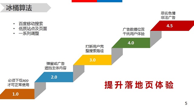 下面再回顾一下的冰桶算法,它是百度移动搜索针对低质站点及页面的一系列调整,现在是到4.5,这个算法一直会不断地更新迭代下去。冰桶算法1.0,主要是打击你必须下载APP或者必须登录才能这个页面内容,这个周二的时候有一个非常有名的站点也找我,他说这个内容很不错,为什么一直排不上去?新的内容也不再收,后来我在后台给他查了一下,很明显就是因为他所有的内容必须要下载它相关的APP才能观看,这一点来说对于移动搜索的用户实际上是不友好的。