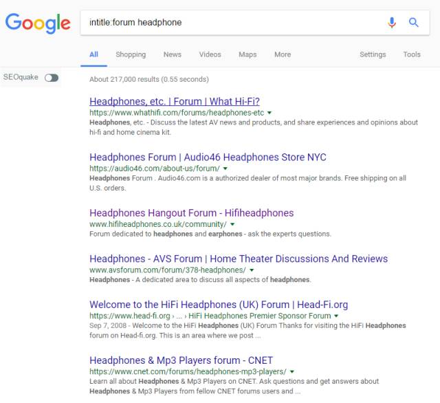 以 intitle:forum headphone为例,查询的在标题中 包含 forum和headphone的关键词,如下图: