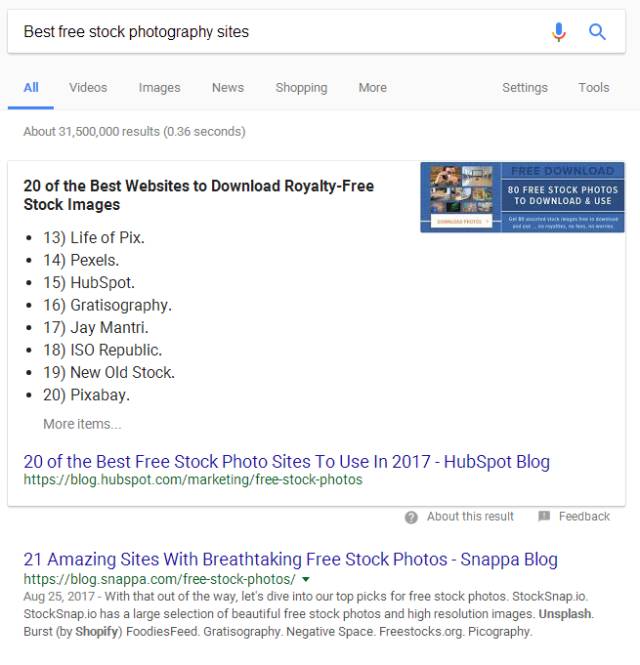 如,我要找到行业免费的图片网站地址:我会在google上这样的直接搜索,Best free stock photography sites